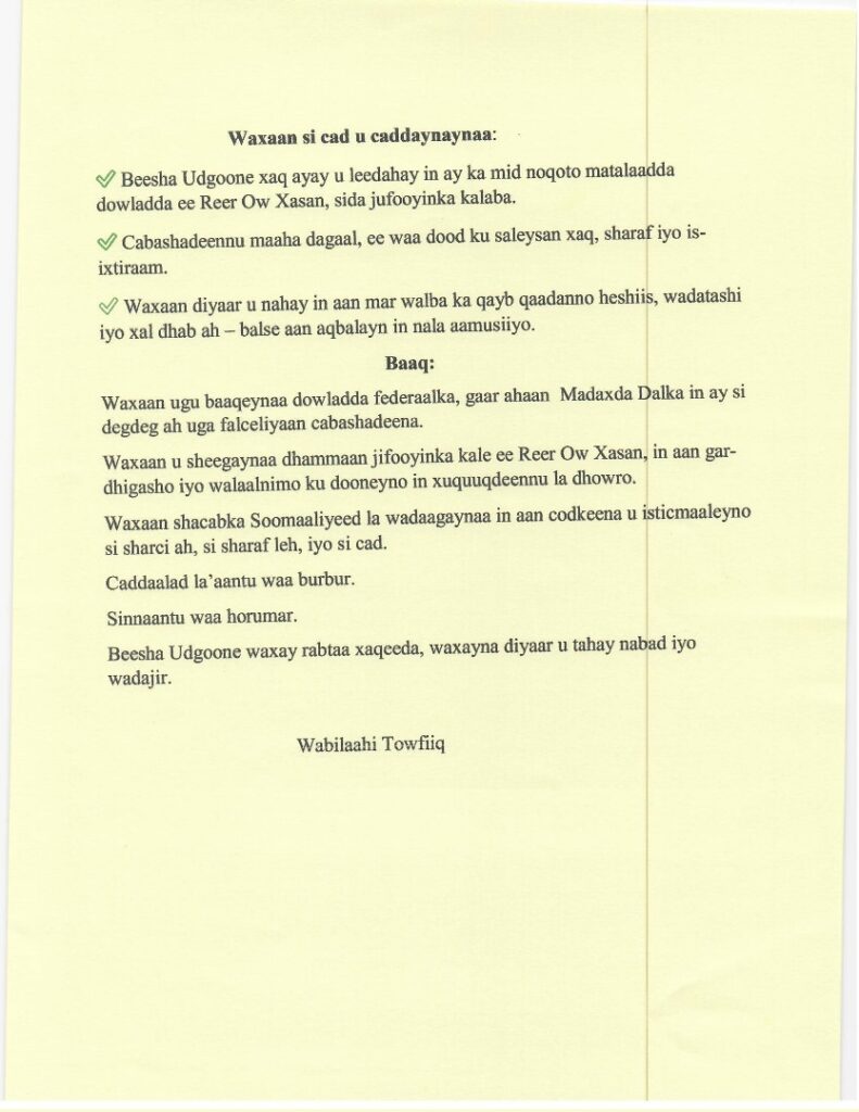 Waxgaradka iyo odayaasha beesha ayaa dowladda Federaalka ka codsaday in ay si dhab ah uga soo farageliso arrimahan, si loo soo afjaro xiisadda iyo khilaafka ka dhex aloosan jufooyinka beesha Reerow Xasan, isla markaana loo xaqiijiyo wada noolaansho iyo cadaalad dhexdeeda.