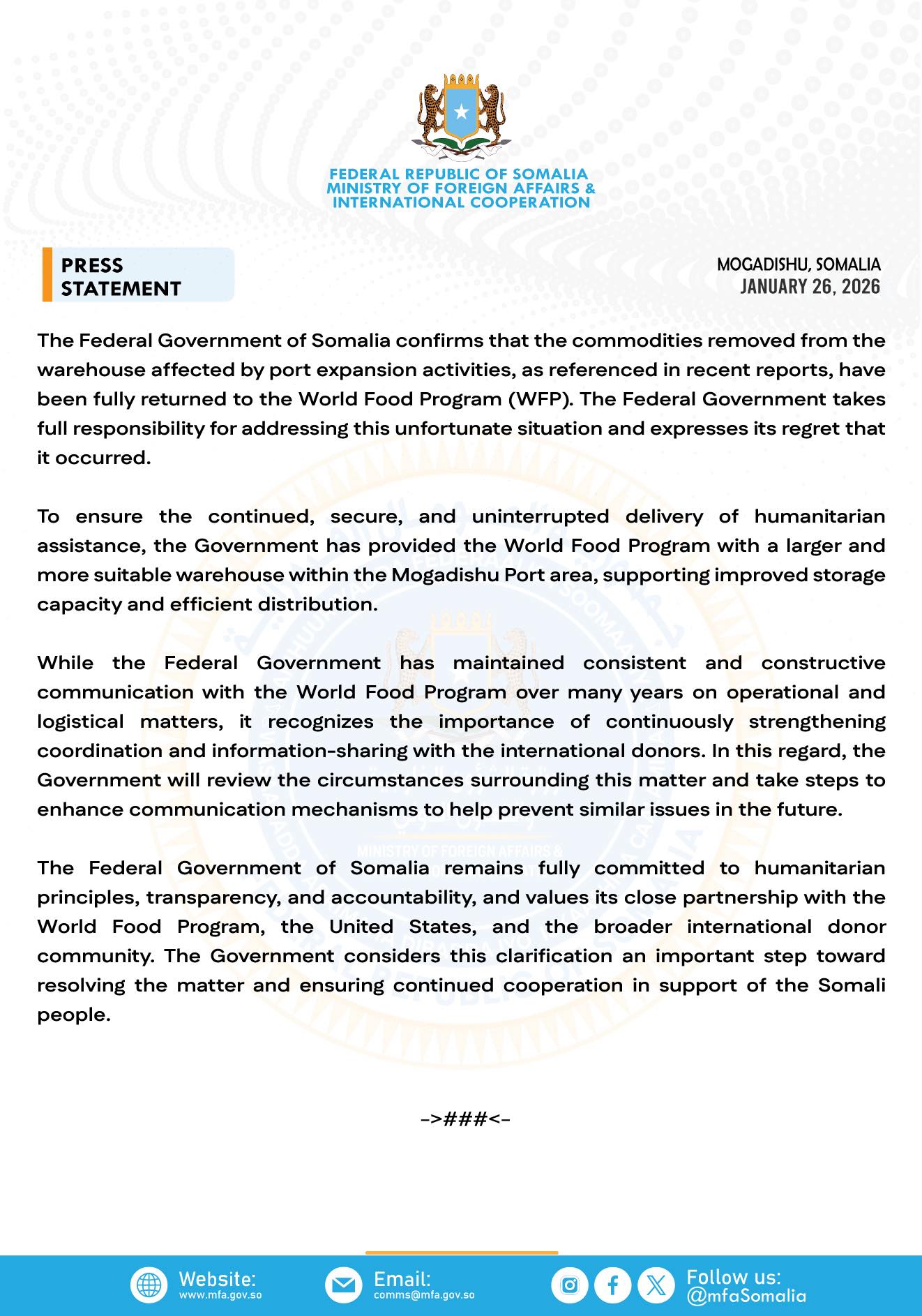 The clarification follows criticism from the United States, which said it would pause certain forms of assistance benefiting the Somali government after raising concerns over the handling of a donor-funded WFP warehouse during port expansion activities.