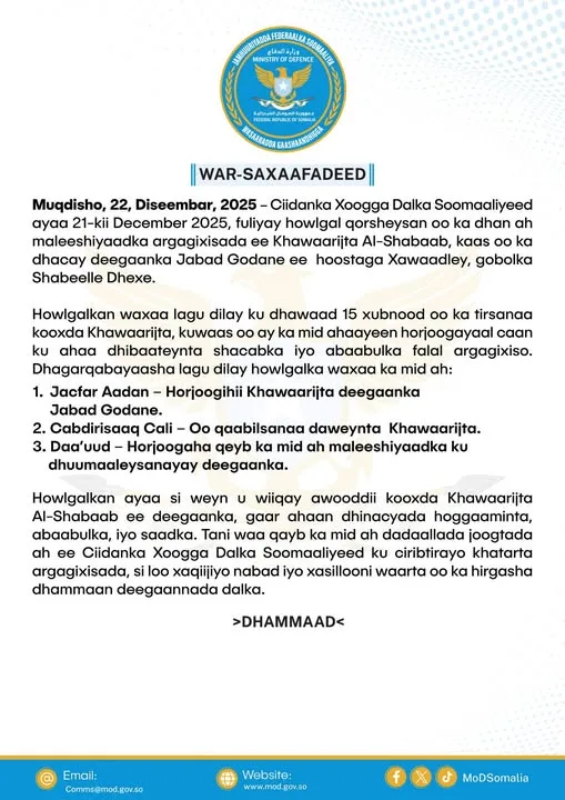 Muqdisho — Ciidanka Xoogga Dalka Soomaaliyeed ayaa 21-kii Diseembar 2025 fuliyay howlgal milatari oo qorsheysan oo ka dhan ah kooxda Al-Shabaab, kaas oo ka dhacay deegaanka Jabad Godane ee hoostaga degmada Xawaadley, gobolka Shabeellaha Dhexe, sida ay xaqiijiyeen ilo rasmi ah.