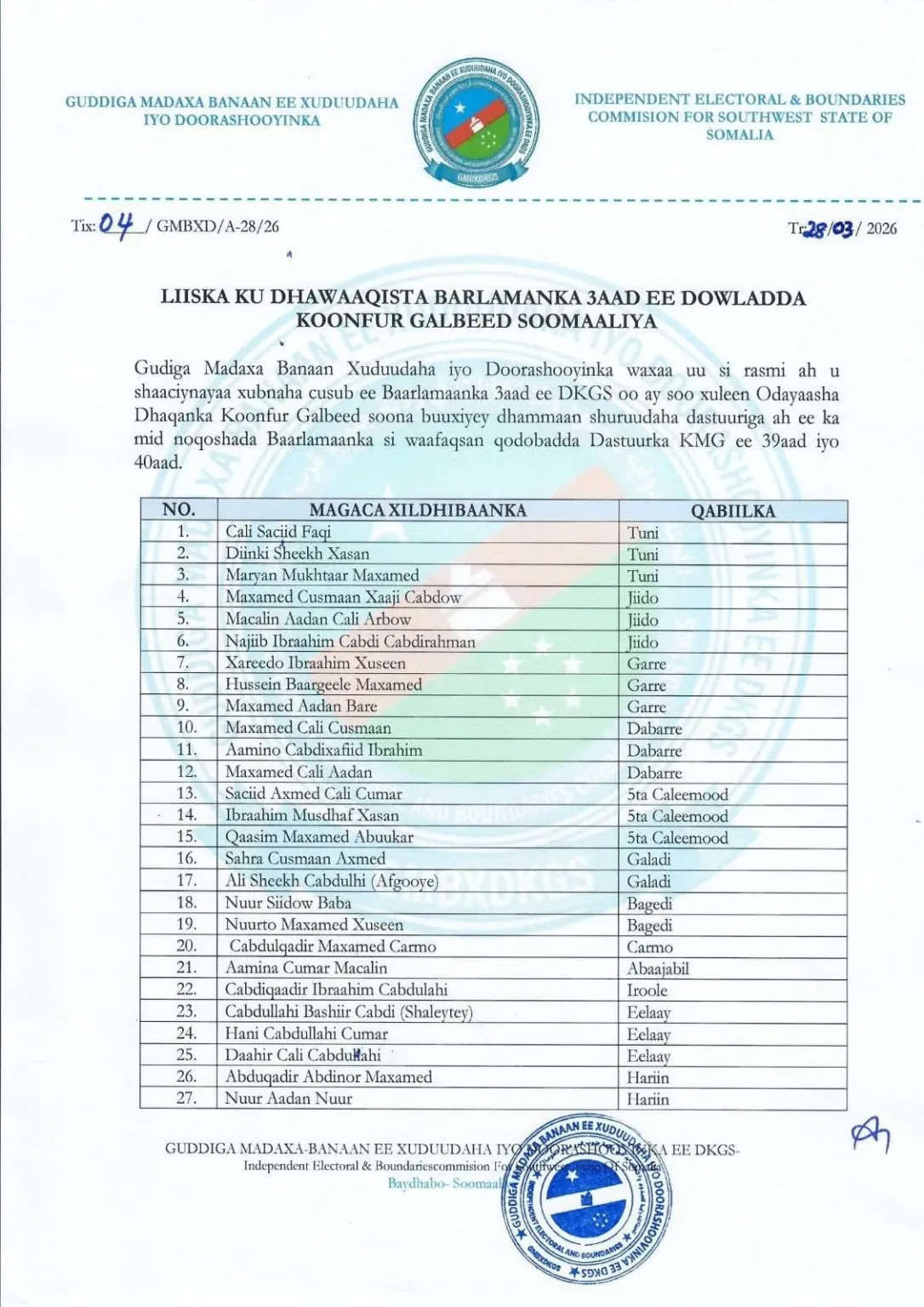 Baydhabo – Dowlad-Goboleedka Koonfur Galbeed ayaa si rasmi ah u shaaciyay liiska xildhibaannada Baarlamaanka 3-aad ee maamulkaasi, kadib marxalado la xiriiray soo xulista iyo ansixinta xubnaha cusub.