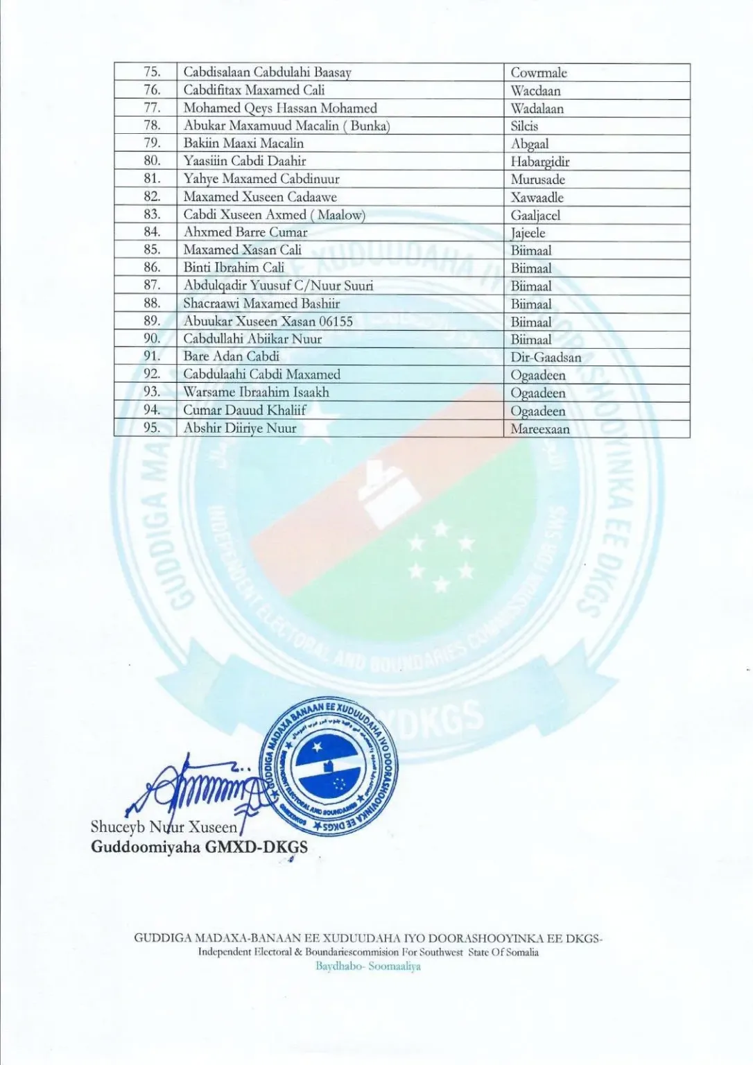 Guddiga madaxa bannaan ee doorashooyinka Koonfur Galbeed ayaa sheegay in liiskan uu ka kooban yahay 95 mudane oo buuxiyay shuruudihii looga baahnaa xildhibaannimada, isla markaana lagu soo xulay hannaan waafaqsan nidaamka iyo xeerarka u degsan maamulka.
