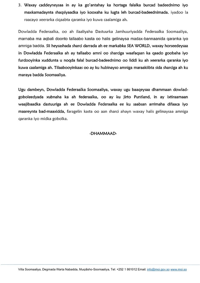 Bayaan kasoo baxay Wasaaradda Warfaafinta Soomaaliya ayaa lagu sheegay in qabsashada markabkan uu yahay xad-gudub ka dhan ah dastuurka dalka, isla markaana dhaawac ku ah midnimada, madax-bannaanida iyo wadajirka dhuleed ee Jamhuuriyadda Federaalka Soomaaliya.