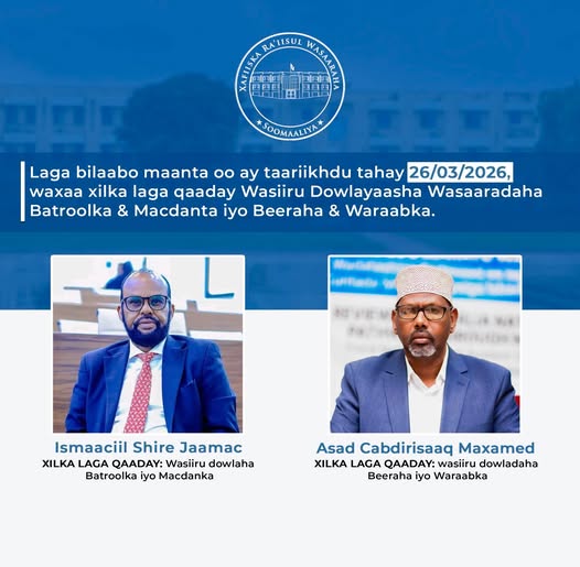 Masuuliyiinta xilka laga qaaday ayaa kala ah Wasiiru-dowlaha Wasaaradda Batroolka iyo Macdanta, Ismaaciil Shire Jaamac, iyo Wasiiru-dowlaha Wasaaradda Beeraha iyo Waraabka, Asad Cabdirisaaq Maxamed.